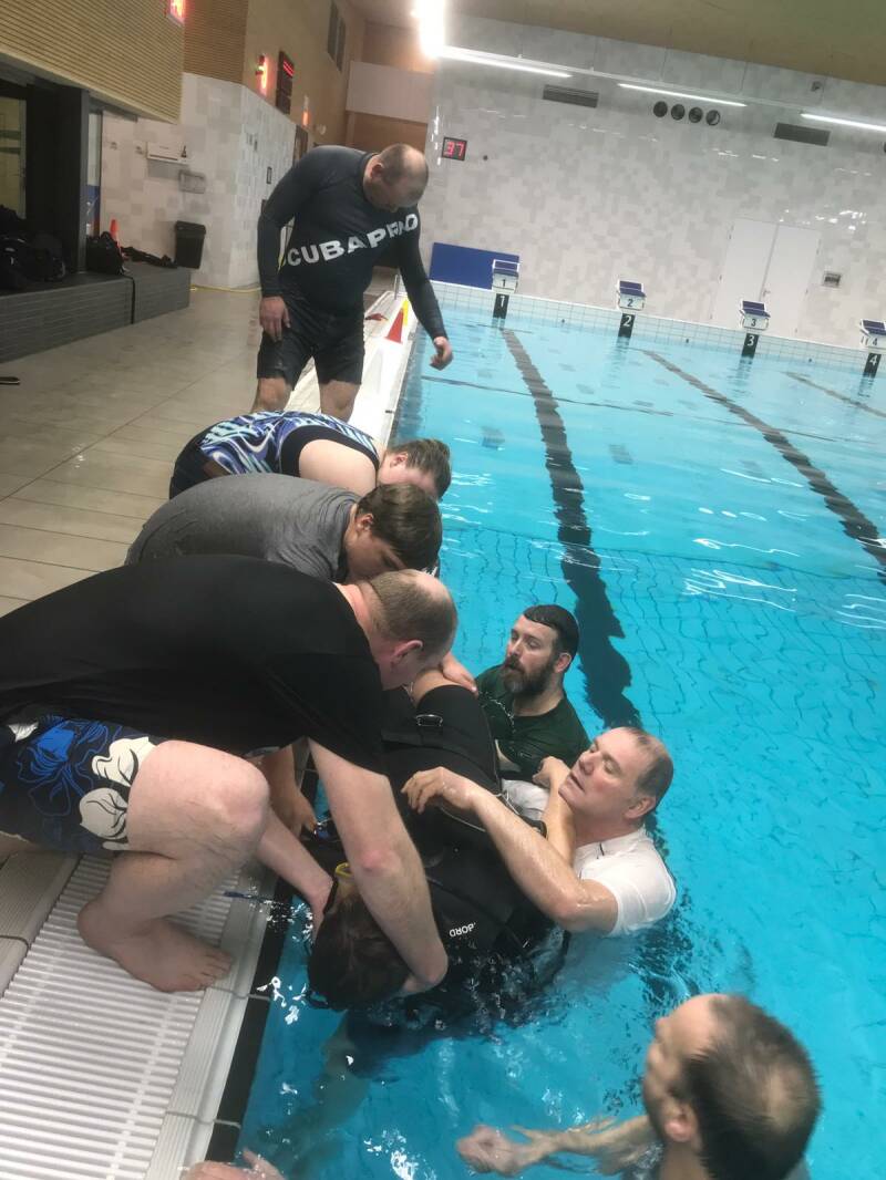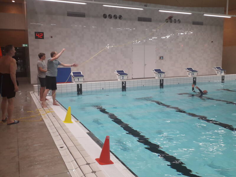 Afgelopen vrijdagavond(8 maart 2019) is er een cursus toezichthouder in het zwembad gegeven. Eerst een deel theorie in het clubgebouw en daarna oefenen in het zwembad.Tijdens de cursus werd er aandacht besteed aan het redden van de kant, redden vanuit het water en het redden van een duiker, met uitrusting, vanaf de bodem.